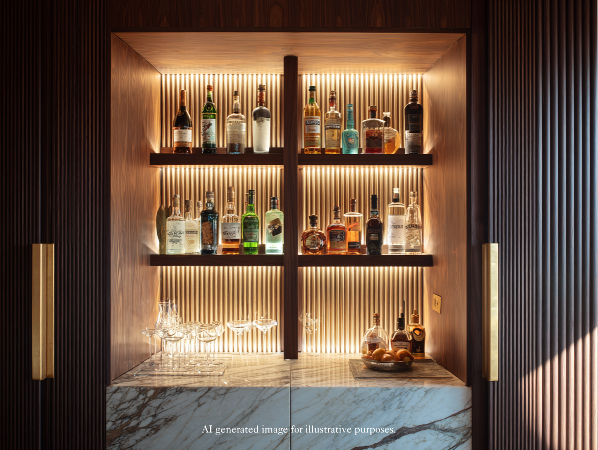 Fluted wood molding in a built-in bar.