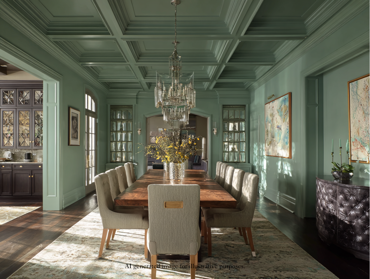 1.Color drenching — Saturating a room with one color can make the entire space feel more cohesive and provide a backdrop for focal-point features such as custom artwork, bespoke furniture, or thoughtfully chosen chandeliers. If you’re not ready to fully commit to color drenching the ceiling, consider starting by painting all of the walls and trim and then perhaps painting the ceiling later.