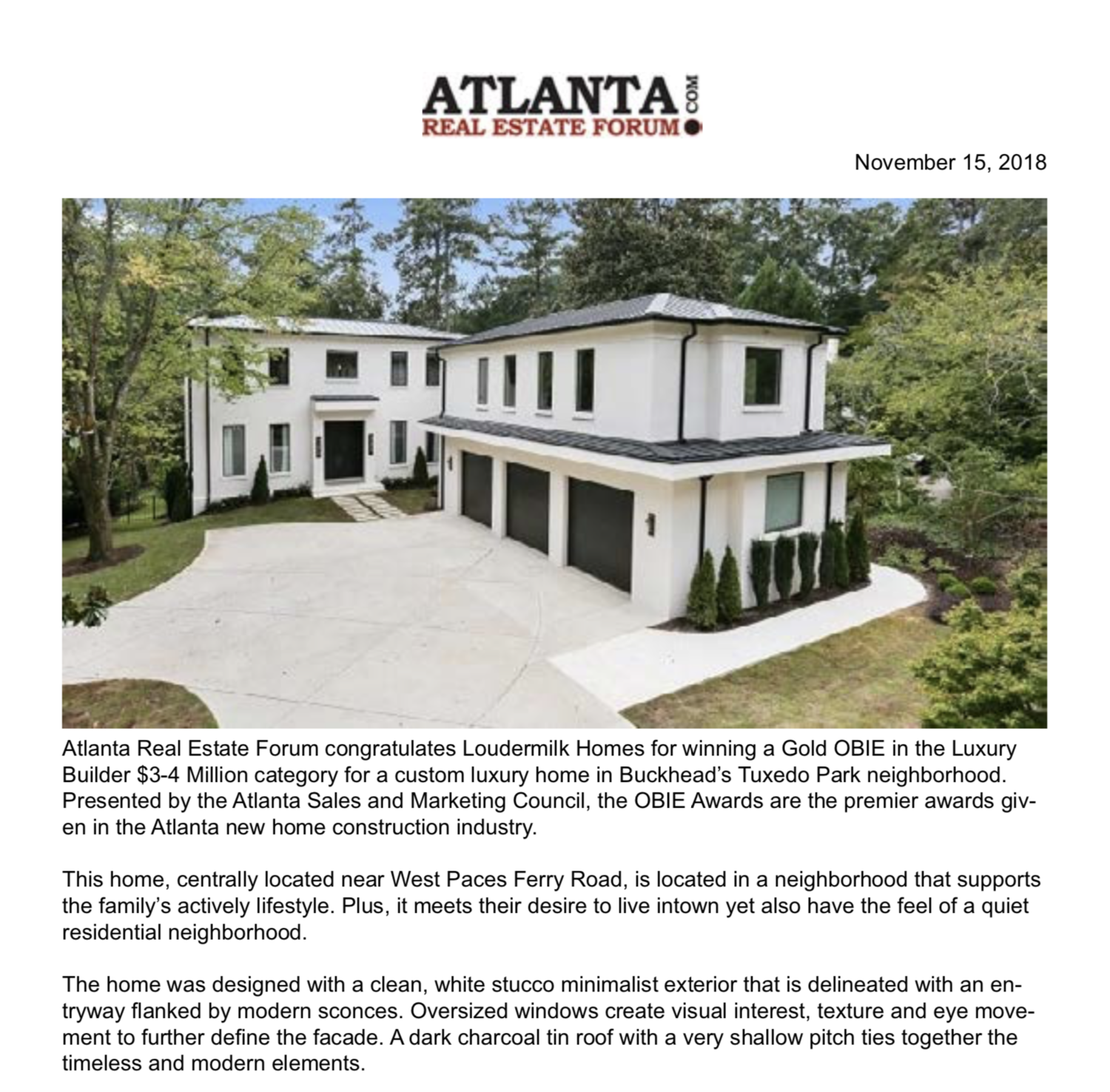 Atlanta Real Estate Forum congratulates Loudermilk Homes for winning a Gold OBIE in the Luxury Builder $3-4 Million category for a custom luxury home in Buckhead’s Tuxedo Park neighborhood.