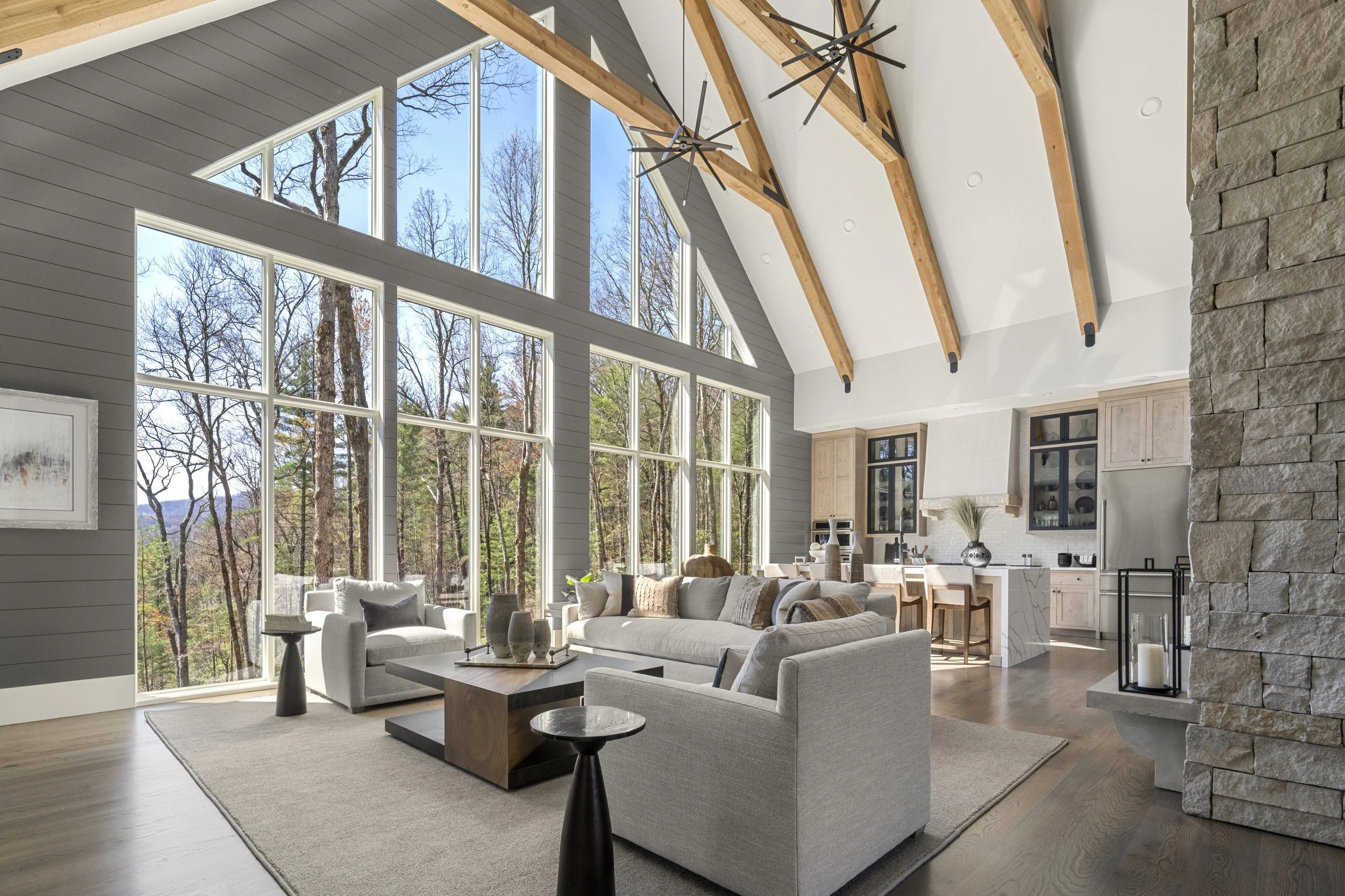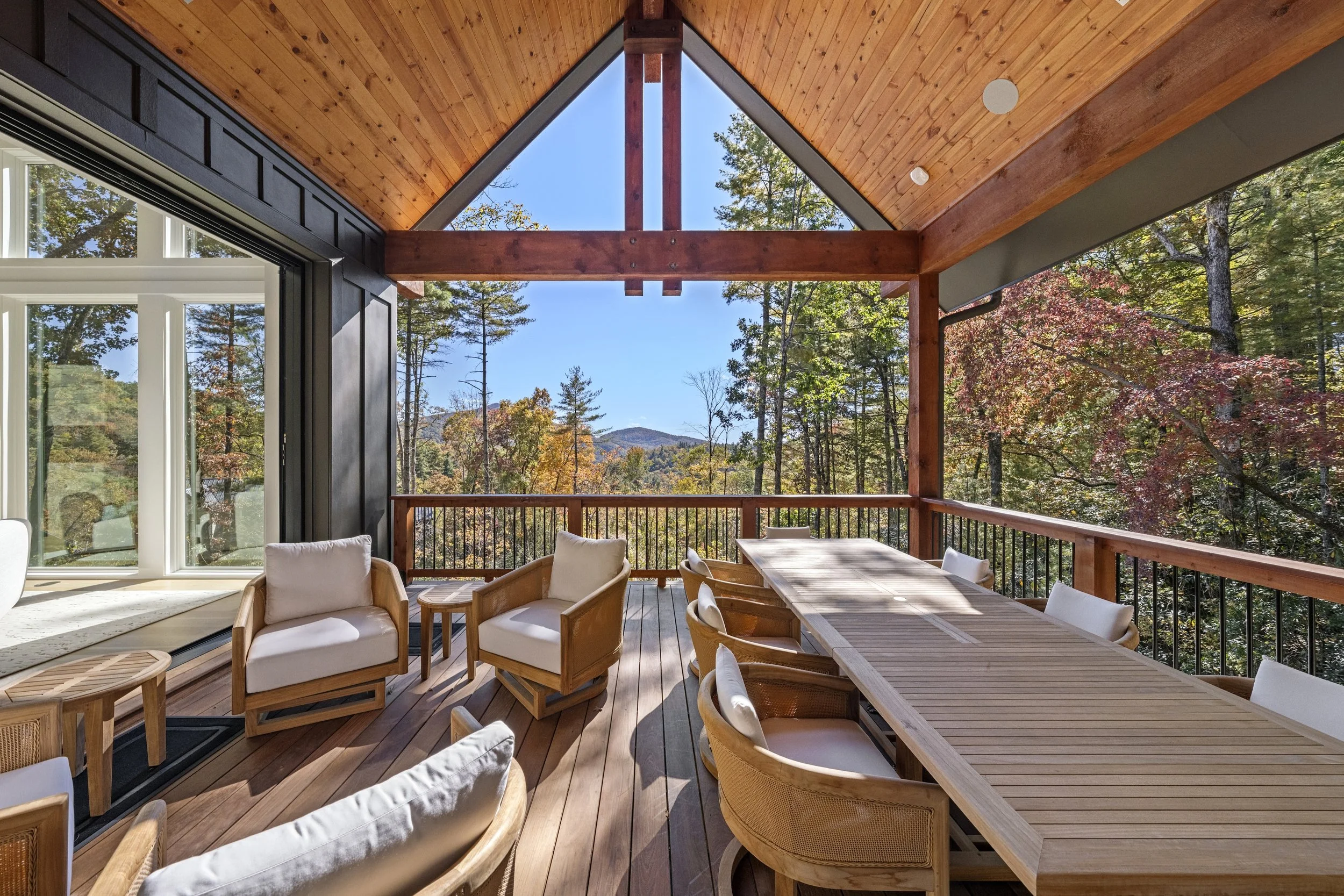 Rustic, wooden elements were embedded throughout the custom home, most notably the Grand Room. Wooden beams overlook the room in cabinesque fashion, adding a rustic flare to the home. Full-height sliding pocket glass doors open from the great room to an expansive, covered balcony, allowing the clients to enjoy fresh air and beautiful mountain views.