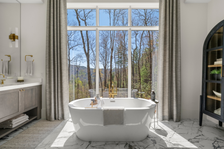 A spa-inspired luxury bathroom in a Southern Living Custom Builder Showcase Home designed and built by Loudermilk Homes in the Saratay Falls community in Cashiers, NC.