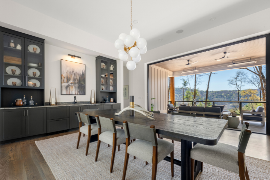 The dining room and outdoor covered balcony at a home designed and built by Loudermilk Homes in the ultra private Saratay Falls community in Cashiers, NC.